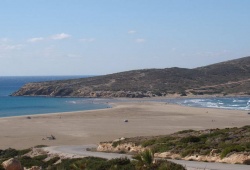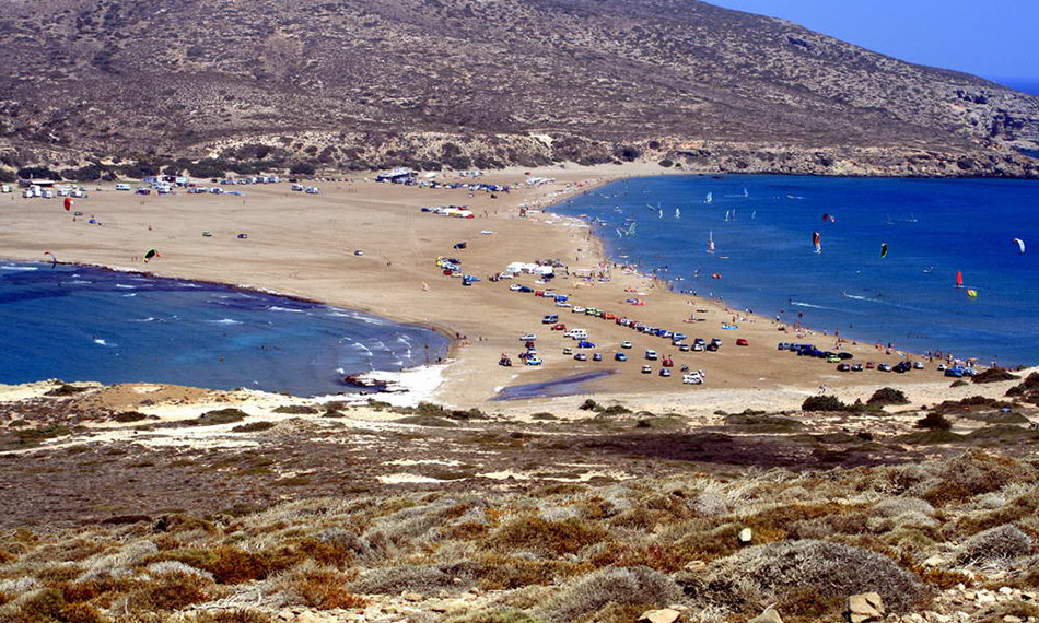Prassonissi Beach in Rhodes, Greece, is a long and wide expanse of sandy shoreline located 85 km south of Rhodes Town and 40 km southwest of Lindos village. This beach is a mecca for windsurfing enthusiasts, particularly during the months of July and August when the north winds, known as meltemi, are in full force. Visitors can witness expert windsurfers showing off their skills while enjoying the crowded beach. Prassonissi Beach is comprised of two sandy coves that both end in a rocky island, which can be accessed either on foot or by swimming, depending on the water levels. Although windsurfing equipment is available for rent, most surfers bring their own gear. Should you need a break from the water, there are taverns and rentable rooms located in close proximity to the beach. The landscape of Prassonisi Beach is idyllic, and the waters are incredibly clear and pristine.