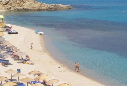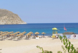 Mykonos Beaches - Located just 10 km from the island's capital, Agrari Beach in Mykonos, Greece is a hidden gem that's often overlooked in favor of the more popular Elia Beach. However, for those seeking a quieter and less crowded option, Agrari Beach is the perfect choice. Accessible by local bus or taxi boat, both Agrari and Elia beaches share a long stretch of sandy shoreline. While the approach involves a steep and narrow road, visitors are rewarded with stunning views. On Agrari Beach, there is a single cafeteria and two sets of beach loungers with shades. This peaceful beach is also known for attracting many nudists. Visitors can also take a scenic walk over the rocks to the left to visit nearby Elia Beach. Don't miss out on the tranquility and natural beauty of Agrari Beach in Mykonos, Greece.