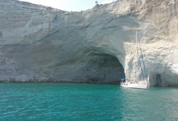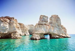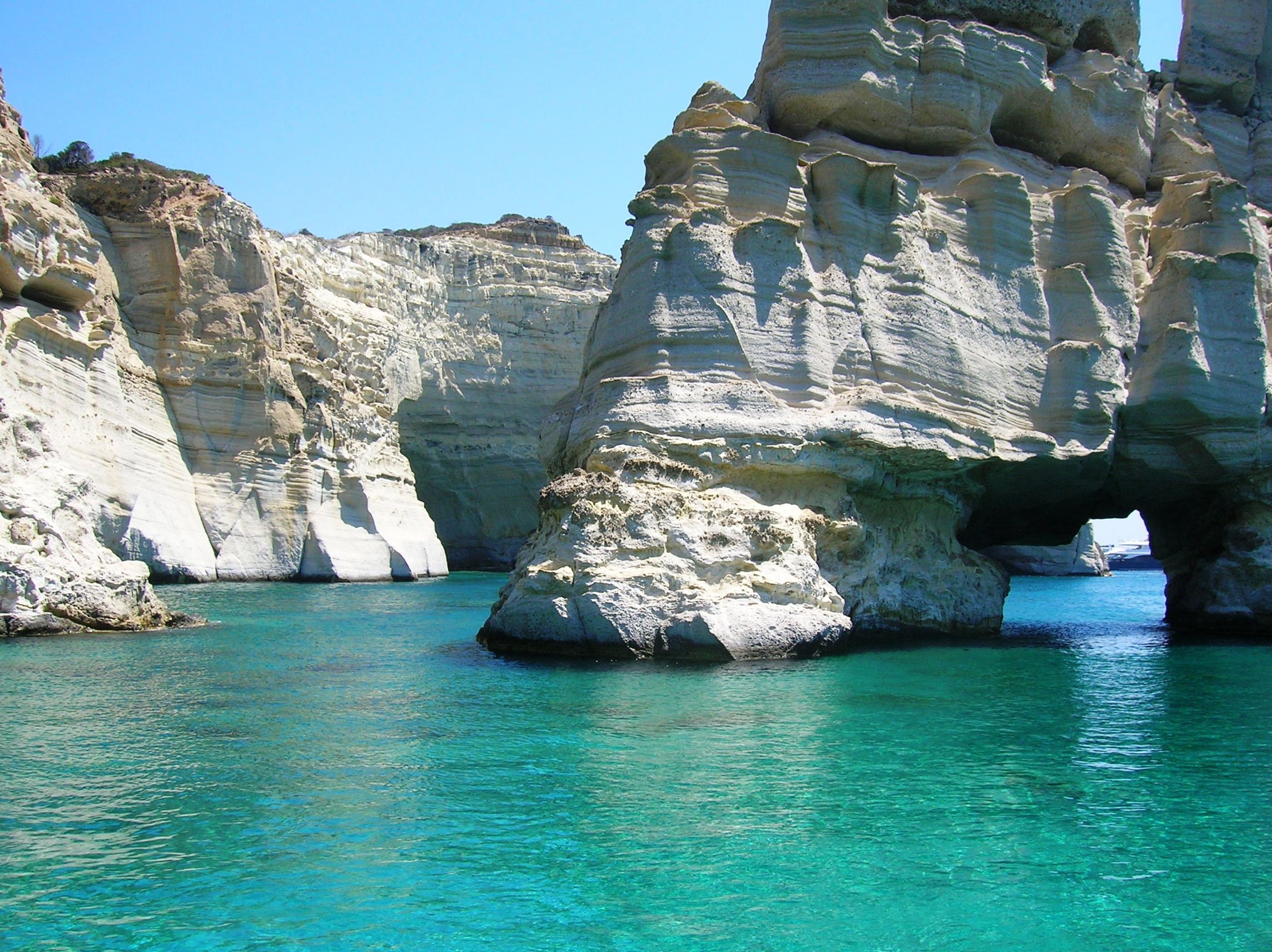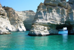 Mylos Beaches - Kleftiko Beach, situated in the southwest region of Mylos Island, Greece, is a stunning destination reachable only by boat. This exclusive accessibility adds to the excitement of excursions around Milos. It is said that one of the caves at Kleftiko was a pirate hideaway where treasure was hidden, yet never uncovered. The beach boasts crystal-clear waters, inviting visitors to take a refreshing swim, with many leaping into the water straight from the tour boats. Visit Kleftiko Beach for an unforgettable experience in Greece.