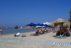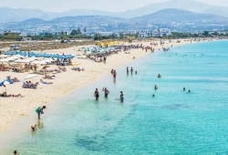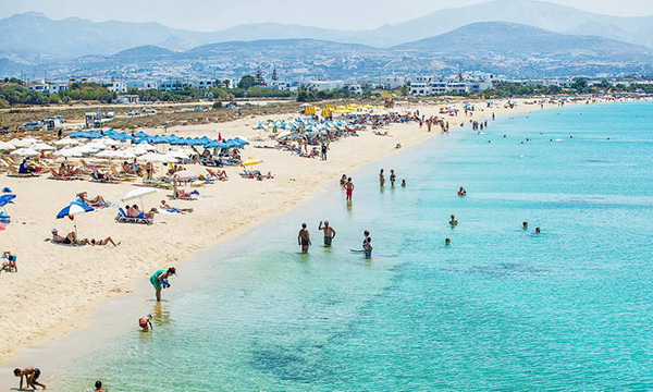 Naxos Beaches - Agios Georgios Beach in Naxos, Greece, is a must-visit destination for beach lovers. As the closest beach to the capital, it's a popular choice and can get crowded. It stretches for several kilometers and is fully organized, offering sun beds, umbrellas, and various water sports facilities for rent. You'll immediately notice the size of the beach, which is much longer compared to other Cycladic islands. Another unique feature is the waves, which increase in size further from the town. The sand is soft, and the water is clear, providing an excellent view of Paros across the sea. The southern end of the beach is a haven for windsurfers, with Agios Georgios Beach being one of the island's most famous spots for this activity. Here, you can take windsurfing lessons, thanks to the shallow waters and good winds. The beach is lined with restaurants and cafes, with plenty of hotels, rooms for rent, and studios in the surrounding area. Make sure to add Agios Georgios Beach in Naxos, Greece, to your beach bucket list.