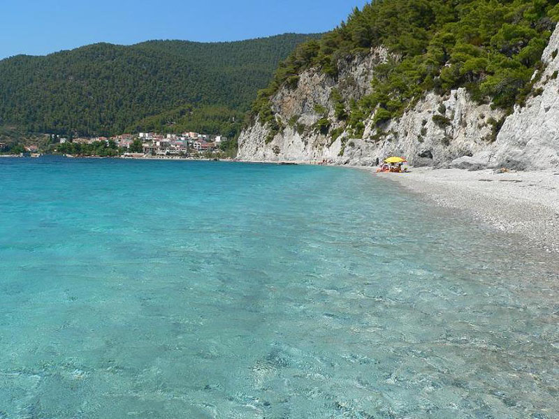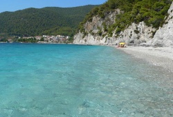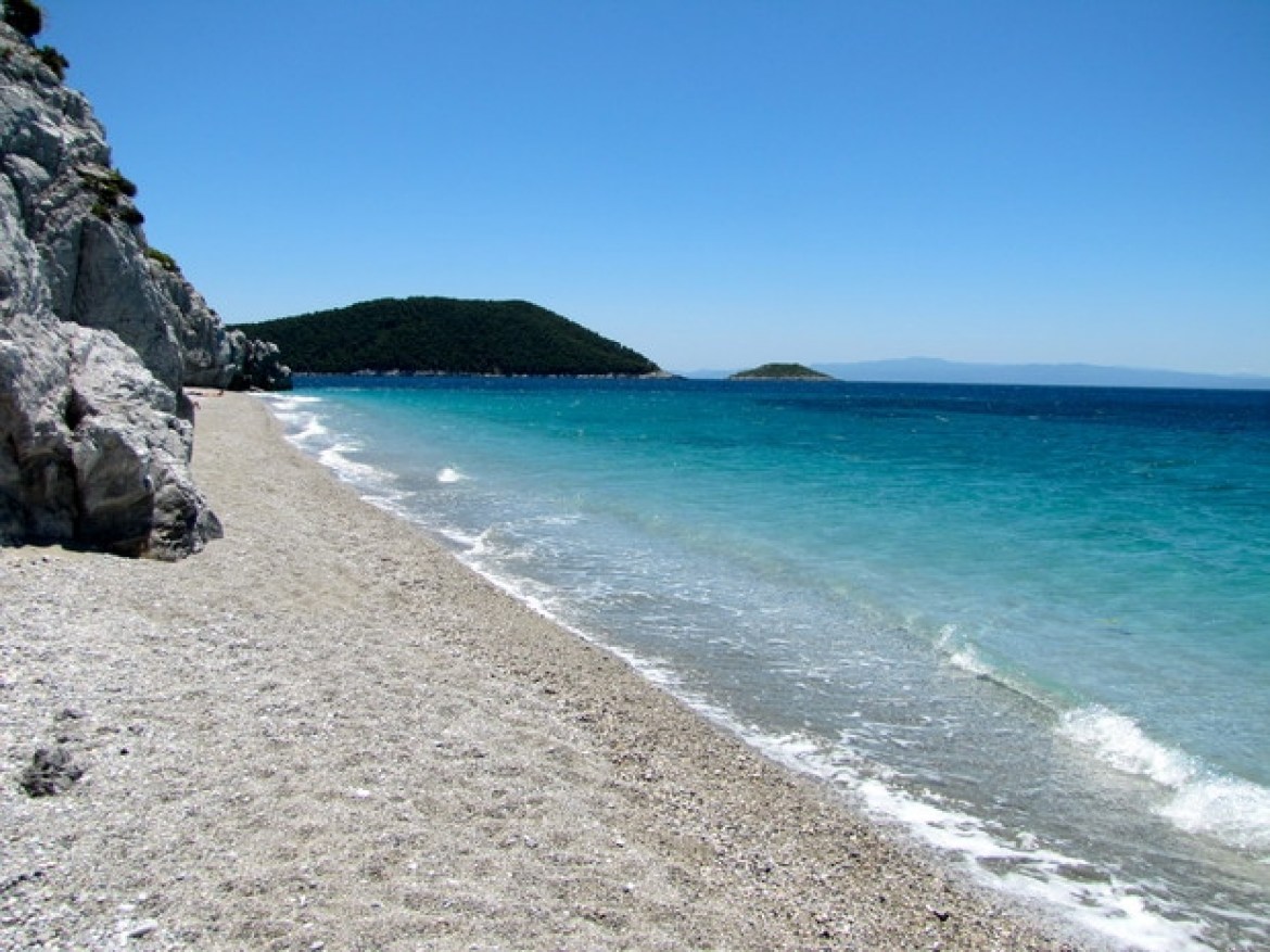 Skopelos Beaches - Hovolo Beach in Skopelos, Greece is a true gem that boasts of crystalline waters and a tranquil atmosphere, making it among the most stunning beaches in the region. Nestled on the western coast of the island and approximately 18 km from Skopelos Town, the beach features three distinct coves, each with its own unique charm. The area is surrounded by massive rocks adorned with sparse vegetation that extend to the shore, and the crystal-clear water blends perfectly with the astonishing rocky landscape. While there are no watersports facilities or beach bars on the beach, you'll find a serene and peaceful environment, similar to most beaches in Skopelos. Exploring the coves on foot offers an opportunity to discover the natural beauty of Hovolo. Along the beach, several traditional taverns offer mouth-watering delicacies. Hovolo is also conveniently located near Elios, a popular beach destination.