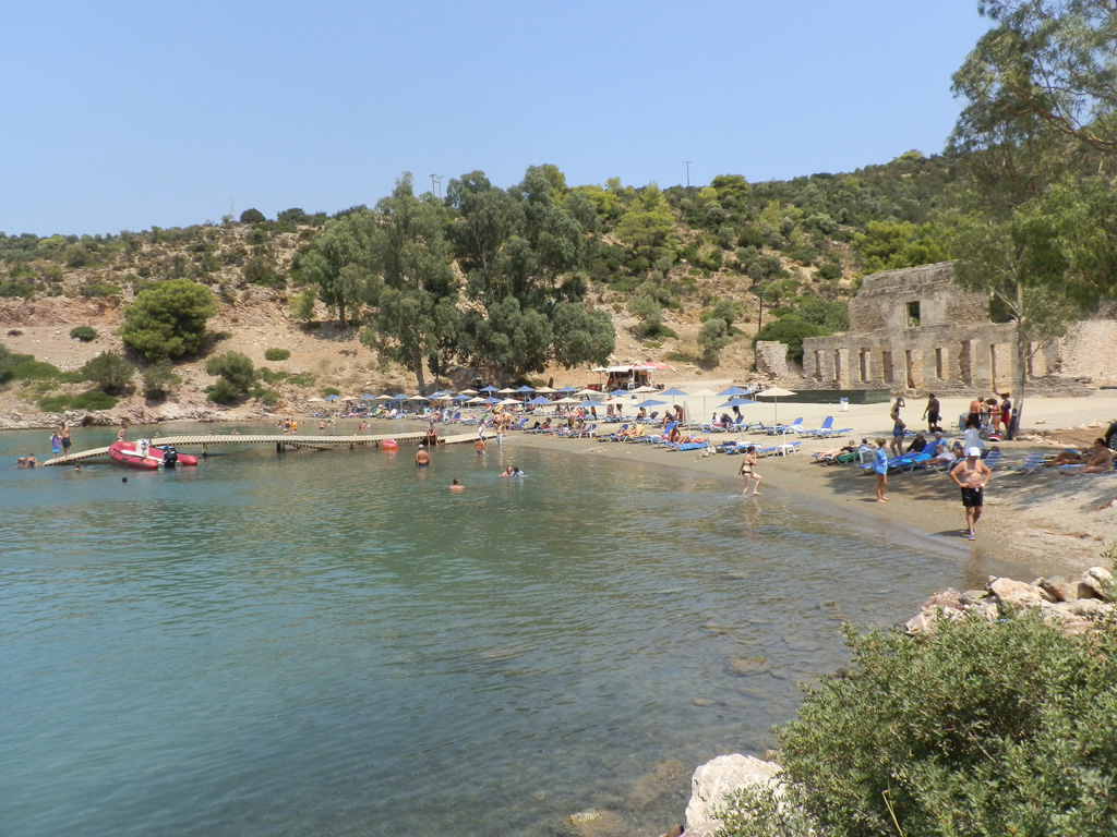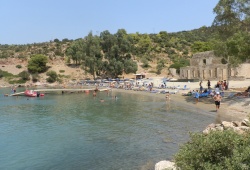 Poros Beaches - Discover the beauty of Russian Bay in Poros, Greece - a stunning sandy beach with crystal-clear waters, located near the renowned Russian Naval Base site. While the beach is not organized, visitors can enjoy refreshments at the beach bar or bring their own supplies for the ultimate day at the beach. Protected from winds, Russian Bay is the perfect destination for those seeking peace and relaxation. Book your trip today and experience the tranquility of Russian Bay in Poros, Greece.