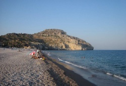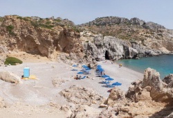 Rhodes Beaches - Traganou Beach in Rhodes, Greece is a stunning natural wonder located just 20 km south of Rhodes town and 4 km from Faliraki Beach. While only a small part of the beach is organized with sun beds and umbrella rentals, the rest of the beach is left to its natural beauty, with small, light-colored pebbles dotting the shore and crystal-clear waters perfect for swimming. One of the highlights of Traganou Beach is its superb cave, which adds a unique and magical atmosphere to the whole area. For those looking to refuel after a day of sun and sand, a small fish tavern is conveniently located nearby. Come discover the magic of Traganou Beach in Rhodes, Greece.