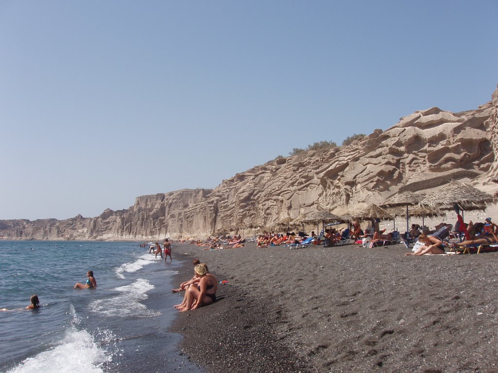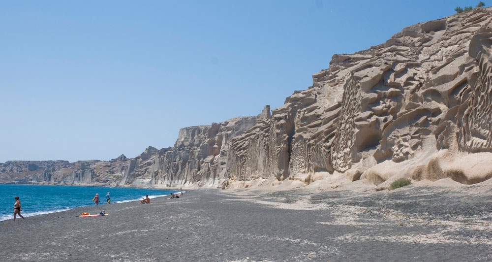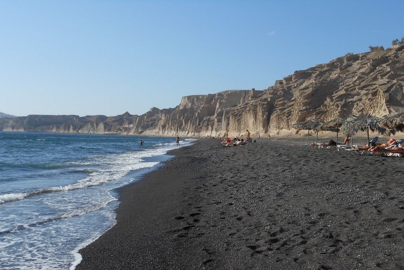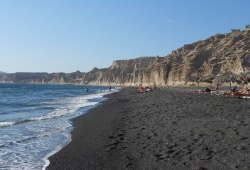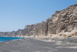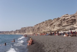 Santorini Beaches - As you approach Vlychada Beach in Santorini, Greece, you'll notice the smooth descent and two large chimneys - one directly behind the beach and one nearby. These brick structures are surprisingly pleasant to look at. The beach is quite long and boasts dark grey sand, which is typical of the island. If you're looking to relax, there are plenty of sun loungers available. However, be sure to take a peek at the captivating rock formations behind the beach - they're truly one-of-a-kind. Discover the unique beauty of Vlychada Beach in Santorini, Greece.
