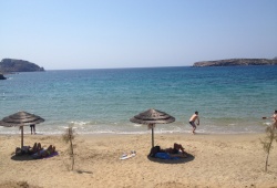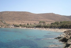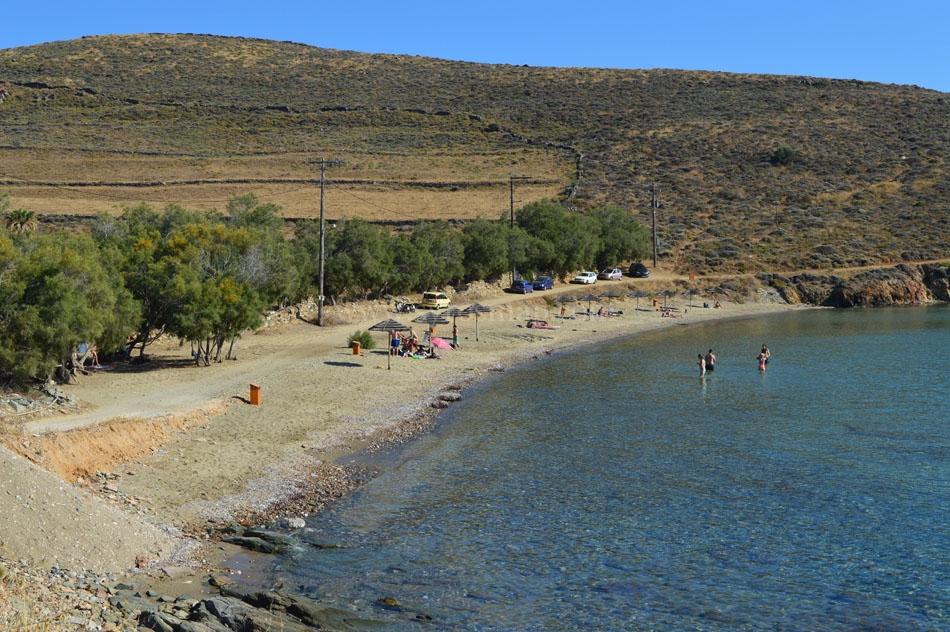 Syros Beaches - Komito Beach in Syros, Greece is a hidden gem located on the peaceful south-west side of the island, just a stone's throw away from the bustling resort town of Agathopes. Perfect for those seeking a tranquil and serene vacation environment, Komito Beach boasts crystal-clear waters and is surrounded by lush olive and cypress trees. Although it may not be as well-known as other beaches on the island, this small but stunning stretch of sand offers a few umbrellas for shade. The nearest shops can be found in the nearby settlements of Poseidonia and Finikas, accessible via an unpaved track just 1 km away. Experience the beauty and serenity of Komito Beach on your next visit to Syros, Greece.
