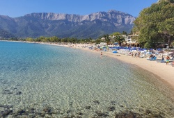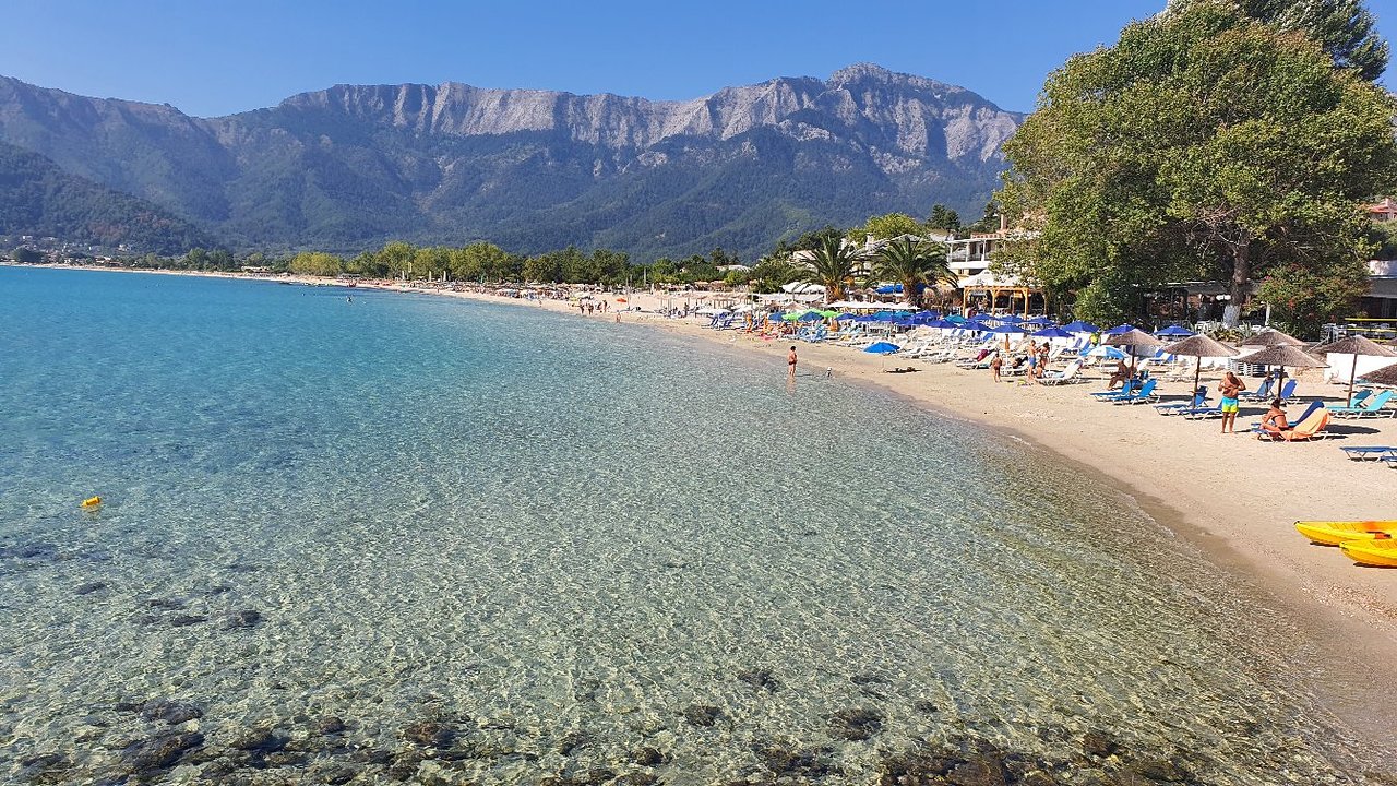 Thassos Beaches - Hrisi Ammos Beach in Thassos, Greece is a stunning sandy beach with crystal-clear turquoise waters. It is situated 12km from Limenas and south of Makriamos Beach, making it one of the most picturesque beaches on the island. Surrounded by lush greenery, this beach boasts a plethora of amenities for visitors to enjoy. With its excellent organization, Hrisi Ammos Beach is perfect for families with young children, thanks to its shallow waters that are safe for little ones to splash around in. Experience the beauty of Hrisi Ammos Beach in Thassos, Greece, and create unforgettable memories.