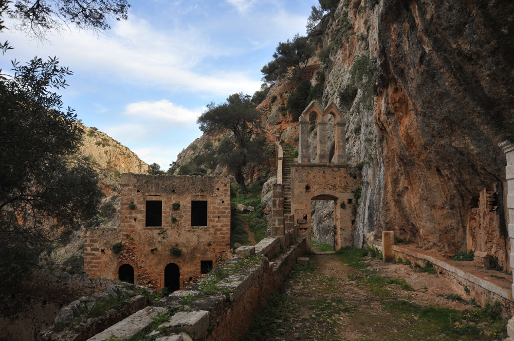 Chania Churches & Monasteries - If you're looking to visit Moni Katholikou in Chania, Crete, take a walk down the road from Gouverneto Monastery or through the Awlaki Gorge on the stone bridge. Despite a lack of scientific evidence, monks claim it's the island's oldest monastery. While the site is now in ruins, you can still access it via a path starting at Gouverneto Monastery. During your visit, you'll see St. John's Church, the monks' cave shelter, and an impressive old bridge crossing the river canyon. Plus, there are plenty of storage and service areas located beneath the bridge's floor.