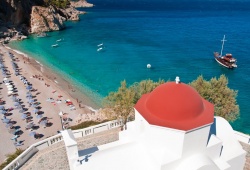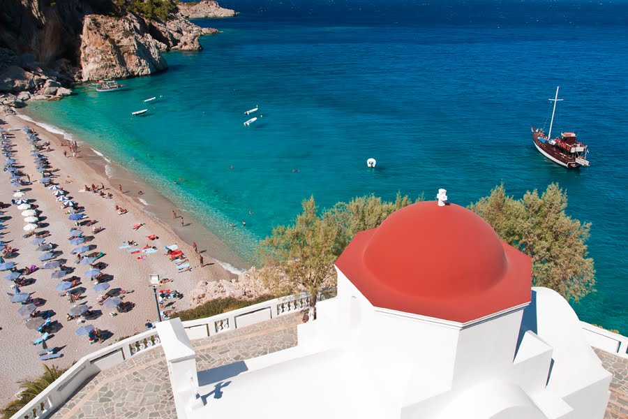 Karpathos Churches & Monasteries - Kyra Panagia Church in Karpathos, Greece is a stunning white church with a striking red dome situated above a scenic beach in the charming village of Aperi. It is widely regarded as one of the most visited and sought-after churches not only in Karpathos but also in Greece. One cannot help but marvel at the breathtaking panoramic views that surround this magnificent structure.