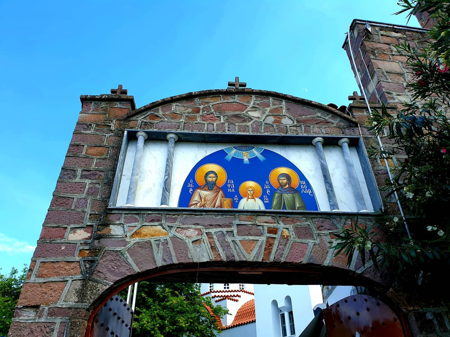 Lesvos Churches & Monasteries - The Agios Raphael Monastery in Lesvos, Greece sits atop Karyes Hill, affectionately referred to as the Hill of the Monk. Located 14 km north of Mytilini, this holy site is dedicated to the Holy Martyrs Raphael, Nicholas, and Irene. Each Easter Tuesday, Christians from nearby villages gathered to perform a mass, and many claimed to have seen a monk carrying a sensor wandering the grounds. This monk, known as Raphael, revealed himself to young and old, men and women alike, often appearing as a priest or a simple monk. According to tradition, Raphael was martyred by the Turks on April 9, 1463, during another Easter Tuesday. Witnesses have reported numerous miraculous events surrounding the monastery and its patron saint.