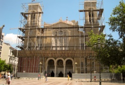 Athens Churches & Monasteries - The Metropolitan Cathedral of Athens, Greece, has a rich history dating back to its foundation on Christmas day in 1842. This awe-inspiring structure was built using marble from 72 demolished churches, and today serves as the cathedral of the Archbishop of Athens and all of Greece. With its three naves and cupola, the Metropolitan Cathedral houses the tombs of two saints who died during the Turkish attack. In 2009, the cathedral underwent a summer renovation and was closed to visitors. A small basilica can be found behind this majestic cathedral. Discover the beauty and history of the Metropolitan Cathedral of Athens, Greece.