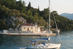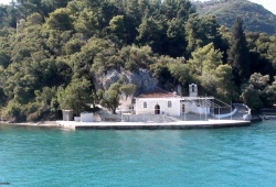 Lefkada Churches & Monasteries - Agia Kyriaki Church in Lefkada, Greece is located in the picturesque Vlichos bay, directly across from Nydri. One of the best ways to visit this sacred site is by renting a small boat. The church, which is owned by Cacon, was constructed in 1906 and features an inscription attesting to its holiness. Adjacent to the building on the left-hand side, just a few meters above ground level, you'll find a small cavern filled with religious icons. Access to the cave is provided via a staircase.