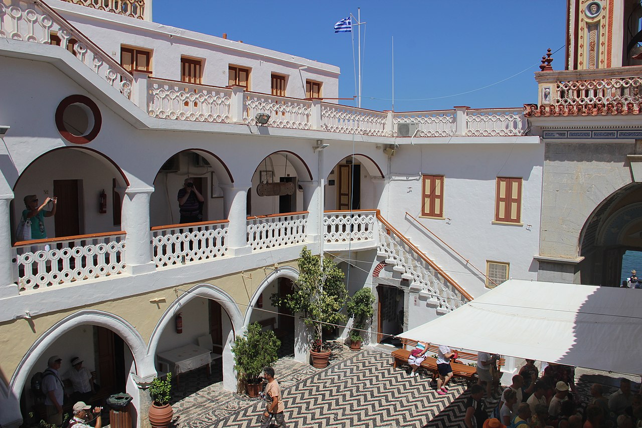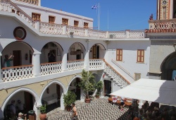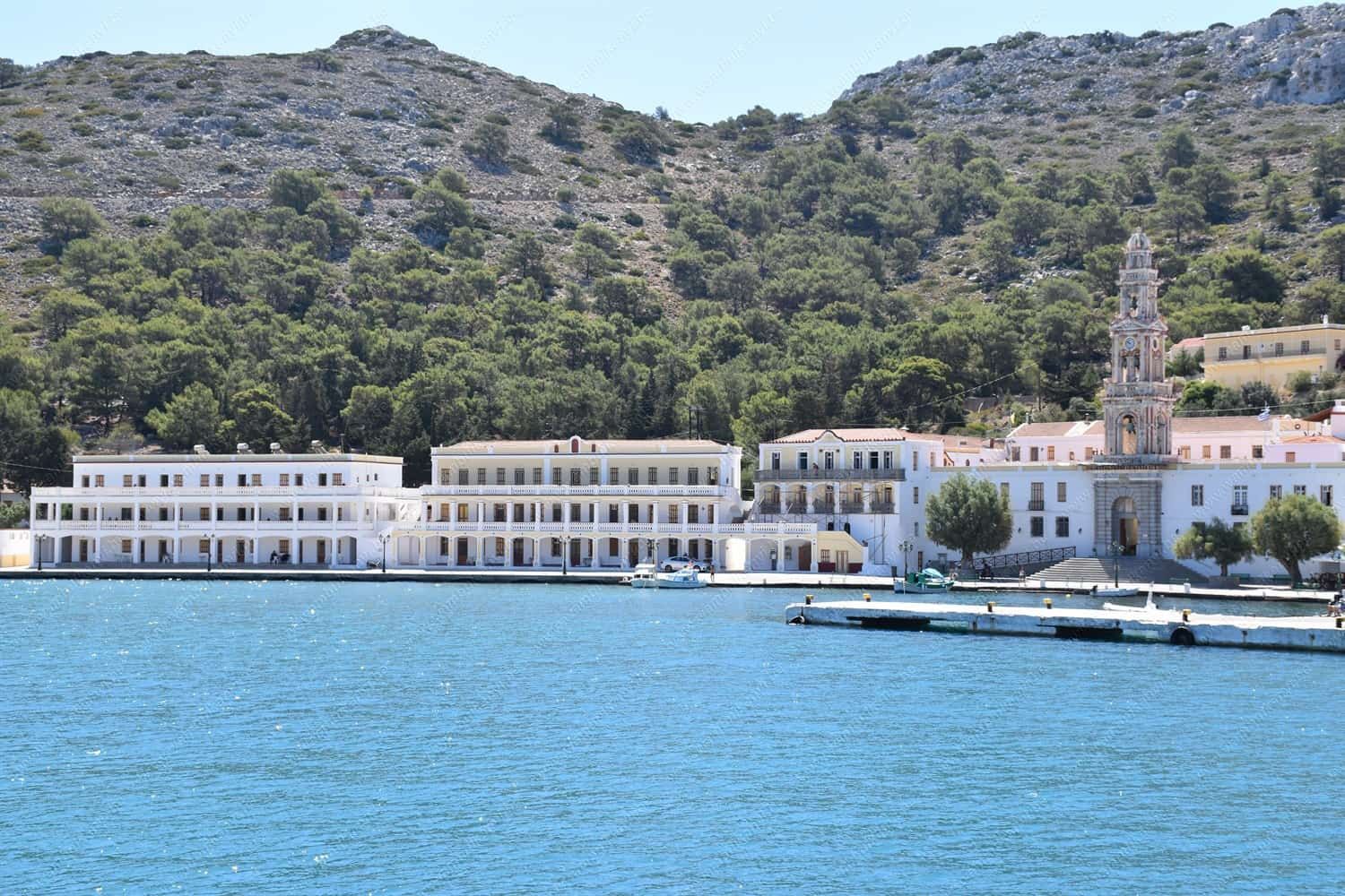 Symi Churches & Monasteries - The Panormitis Monastery in Symi, Greece is a magnificent 18th-century Venetian-style building, boasting the world's highest baroque bell tower. The inner courtyard features a beautiful church and stunning hokhlaki courtyards that were meticulously planned and laid out. Inside the church, you'll find exquisite chandeliers and a silver-leafed representation of Archangel Michael, the patron saint of Symi and protector of the island. If you're interested in history, you can visit the adjacent museum. For a unique experience, climb the steps to the tiered rows of cells still inhabited by monks. Don't miss the opportunity to explore this incredible landmark while in Symi, Greece.