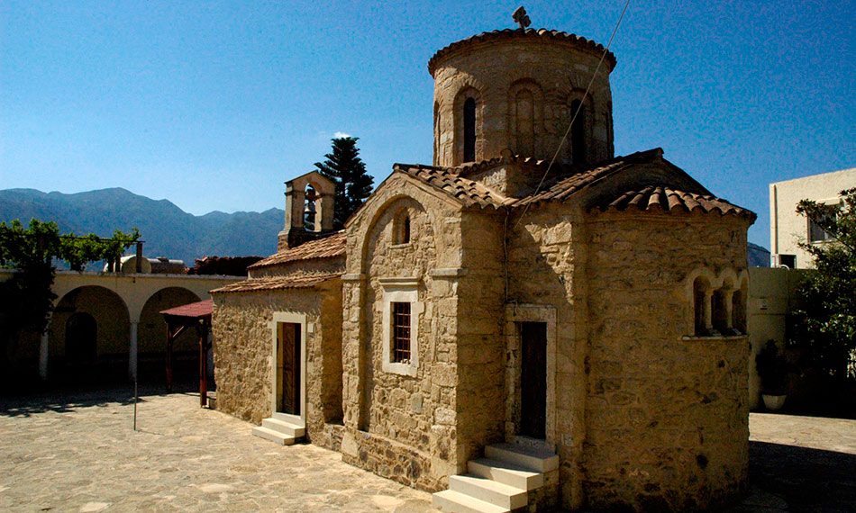 Rethymnon Churches & Monasteries - The Antifonitria Monastery in Rethymnon, Crete can be found in the small mountainous village of Miriokefala, just 29 km south-west of Rethymnon Town. This ancient monastery is believed to have been founded by Saint John Xenos in the 11th century, who also established many other monasteries throughout Crete. According to tradition, Saint John discovered a miraculous icon of the Virgin Mary under a bush after hearing a voice shouting, "Here I am! Here I am!" This is how the monastery came to be named Antifonitria, which translates to "she who shouts".