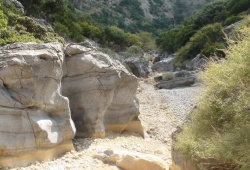 Heraklion Gorges - Aposelemis Gorge in Analipsi, Crete is the most significant geological canyon in the Northern region of Crete, conveniently located near the resort of Analipsi. The Aposelemis River runs through the canyon, which only has water after heavy rain, while the river flows during all wet months. The gorge presents an excellent opportunity for hiking and exploring the surrounding areas, where a path is provided for easier access. The canyon boasts of old trees such as oak, holly, holm, carob, osier, and others. To access Aposelemis Gorge in Analipsi, take the north exit and follow the dirt road from the old national bridge to the canyon. The trail starts after passing the picturesque, abandoned village of Plevris and under the new highway bridge. Allow at least two hours to cross the canyon.