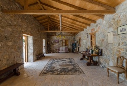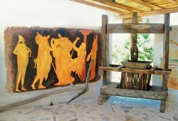 The centerpiece of the center is a two-story house (oikos) that is an exact replica of a 5th-century BC Greek house, complete with a sitting room (estia), bathroom, kitchen, men's room (androon), women's room (genekonitis), and weaving room. The furniture is handmade and modeled after ancient Greek furniture.